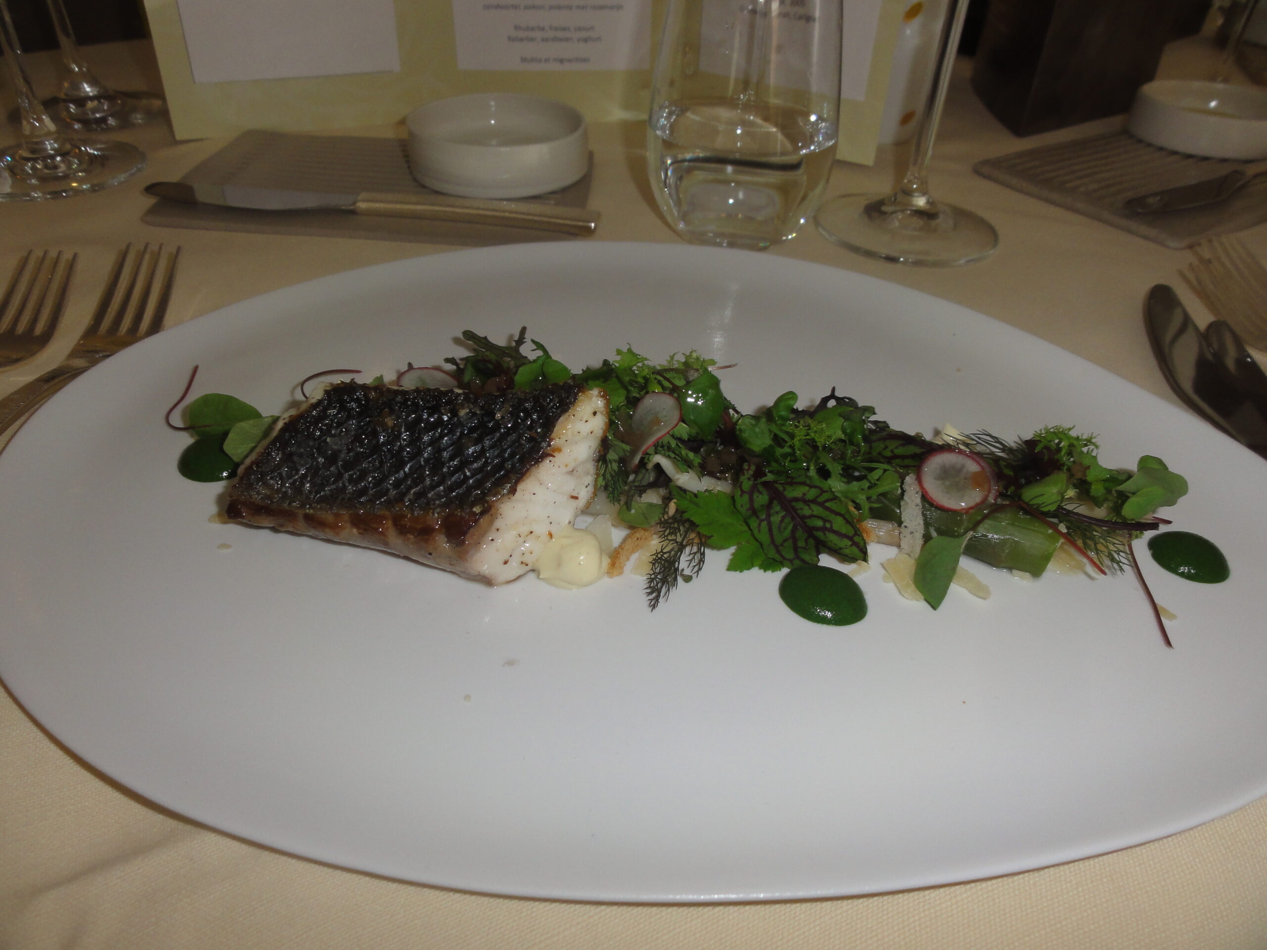 Le personnel de salle cultive l’art de la table jusqu’au moindre détail, comme la présentation élégante des menus ; la présence d’un sommelier sublime la cuisine du chef par une sélection judicieuse des vins, il avait choisi :